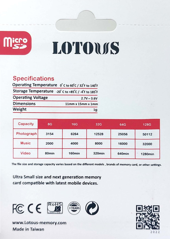 کارت حافظهی 128 گیگابایتی «لوتوس» کلاس 10 و دارای استاندارد سرعت UHS-I است. نگهداری، تماشا و ثبت فایلهای ویدیویی باکیفیت Full HD،4K تنها به ظرفیت بالا برای ذخیرهسازی نیاز ندارد؛ بلکه کارت حافظهای که در نظر گرفته میشود، باید سازگاری ویژهای برای این منظور داشته باشد. کارت حافظههای کلاس 10 مناسبترین ابزار برای این کار هستند. کارتهای این رده بدون هیچگونه لگ یا توقف، فرمت Full HD و 3D و 4K را پشتیبانی میکنند. سرعت خواندن اطلاعت در این کارت، حداکثر 667X است. این سرعت در محدودهی سرعتهای بالا ردهبندی میشود. این کارت با دستگاههایی که پذیرندهی کارتهای microSDHC و microSDXC هستند، سازگار است. تغییرات دمایی بر عملکرد کارت حافظهی لوتوس تاثیری نداشته و اطلاعات آن آسیبی نمیبیند. محدودهی دمایی برای عملکرد بهینهی این کارتها بین -20 تا +85 درجهی سانتیگراد است. در این کارت حافظه شما میتوانید 50112 عکس باکیفیت ، 32000 موزیک و یا 1280 دقیقه فیلم با کیفیت ذخیره نمایید.