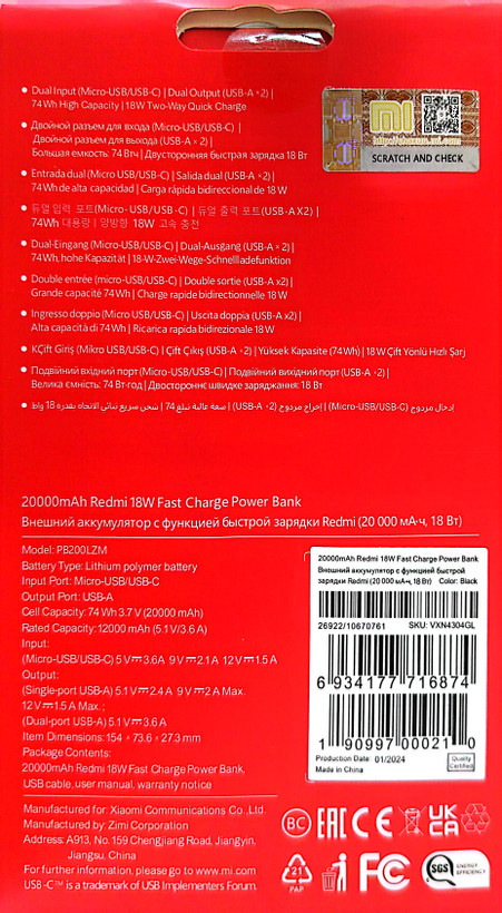 پاور بانک 20000 Redmi شیائومی مدل PB200LZM به همراه یک عدد کابل شارژ 25 سانتیمتری ارائه میشود. این محصول با داشتن دو پورت خروجی USB و پشتیبانی از انواع پروتکلهای شارژ سریع، بهترین همراه شما در خارج از منزل، محل کار و یا هنگام سفر خواهد بود. پاور بانک Redmi با برخورداری از شارژ هوشمند به راحتی میتواند به طور همزمان دو دستگاه را شارژ کند. این محصول با ابعاد 27.3 × 73.6 × 154 میلیمتر به راحتی قابل حمل و جابهجایی است. با استفاده از پاور بانک Redmi میتوانید تمامی انواع گجتهای هوشمند مانند دوربین، تبلت، گوشی، و اسمارت واچ را در طول روز شارژ کنید. پاور بانک همراه شیائومی دارای سیستم محافظت در برابر مشکلاتی مانند نوسانات برق، اتصال کوتاه، تغییرات دما، و جریان اضافی در ورودی و خروجی است. این پاور بانک از پورت خروجی دوگانه USB_A و پورت ورودی دوگانه USB-C و MicroUSB بهره برده است. شایان ذکر است که حداکثر میزان قدرت برای پورت ورودی 5V _2.1A و پورت خروجی آن 5.1V_3.6A است. این محصول با داشتن دو درگاه MicroUSB - TypeC با انواع گجتهای هوشمند سازگار است.