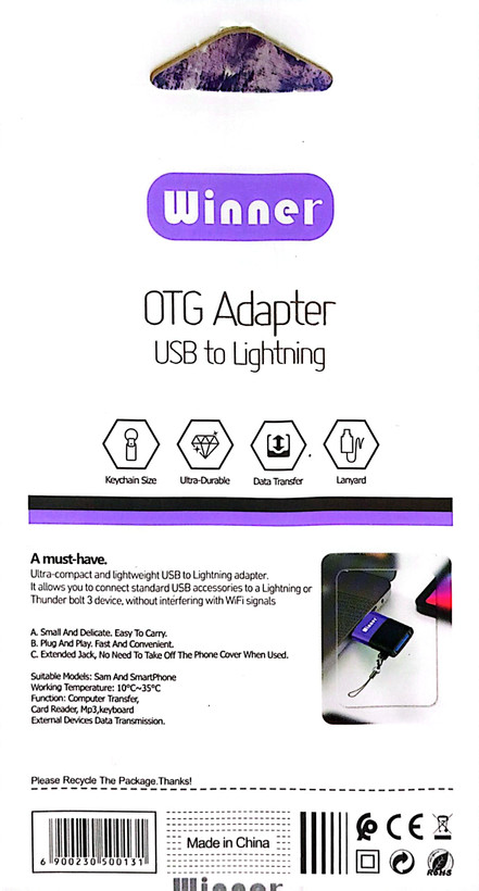 مبدل OTG تبدیل USB به لایتنینگ,وینر، یک مبدل کوچک و کاربردی است که به شما این امکان را میدهد تا دستگاههای دارای پورت یو اس بی و لایتنینگ خود را به یکدیگر متصل کنید. با استفاده از این مبدل، شما میتوانید فایلها و دادههای خود را بین دستگاههای مختلف، از جمله آیفون، آیپد، مک بوک و سایر دستگاه های الکترونیکی، بهراحتی و با سرعت بالا منتقل کنید. این مبدل او تی جی دارای طول 3 سانتی متر است و به شما این امکان را میدهد که دستگاههای خود را به یکدیگر متصل کنید، حتی در فاصله کوتاه. با این حال، باید توجه داشت که برای استفاده از این مبدل، دستگاه شما باید از پورت لایتنینگ پشتیبانی کند. این مبدل OTG دارای طراحی کوچک و سبکی است و به شما این امکان را میدهد که آن را به راحتی در جیب یا کیف خود داشته باشید و با خود به سفر و یا محل کار ببرید. همچنین، با داشتن قابلیت Plug and Play، این مبدل به شما اجازه میدهد که بدون نیاز به نصب درایورهای جانبی، آن را به دستگاه خود متصل کنید و از انتقال دادههای خود به راحتی و با سرعت بالا لذت ببرید