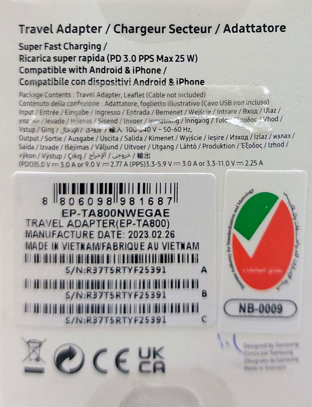شارژر سامسونگ 25 وات (اصل) مدل EP-TA800NBEGAE