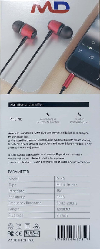 هندزفری MD به دلیل طراحی زیبا و خوبی که دارد، به خوبی در گوش جای گرفته و در استفاده طولانی مدت گوش را اذیت نمیکند. این محصول به شکلی است که صداهای اضافی محیط را تا حدود زیادی کم می کند و باعث بهتر شنیده شدن موسیقی و به طور کلی صدا می شود. وضوح صدای هندزفری های مدل MD بسیار خوب و مطلوب است و آنچه را که شما از یک هندزفری بخواهید، برآورده می سازد. صدای هندزفری MD-D40 به لطف بلندگو هایش بسیار با کیفیت بوده، و موسیقی را با کیفیت استریو برای شما پخش می کند. بنابراین صدایی که می شنوید بسیار طبیعی تر است، چرا که تفاوت منبع تولید صدا را به راحتی متوجه می شوید. همچنین می توانید با استفاده از کلید های تعبیه شده روی ایرفون، به عقب و جلو بردن موسیقی ، کم و زیاد کردن صدا و به طور کلی کنترل موزیک بپردازید. کابل این هندزفری به طول 1٫2 متر می باشد. ایرفون MD تقریبا با تمام گوشی ها و تلفن های همراه سازگار است و قابل استفاده می باشد. این محصول دارای یک جک 3٫5 میلیمتری برای اتصال است. آمپدانس 32 اهمی این ایرفون نیازی به یک آمپلی فایر ندارد و شما به راحتی توانایی استفاده از طریق گوشی خود را دارید. همجنین فرکانس پاسخگویی این ایرفون در بازه 20 تا 20000 هرتز است که به طور کامل بازه شنوایی انسان را پوشش می دهد. شما هیچگونه مشکلی در پخش موسیقی خود از لحاظ فرکانس آن نخواهید داشت. هندزفری های MD در سری های مختلفی به بازار عرضه شده که میتواند تمامی مخاطبین برای استفاده های مختلف را در برگیرد مدل D-40 بهترین مدل برای استفاده در بازی های موبایلی یا کامپیوتری مانند PUBG یا CALLOFDUTY موبایل میباشد.